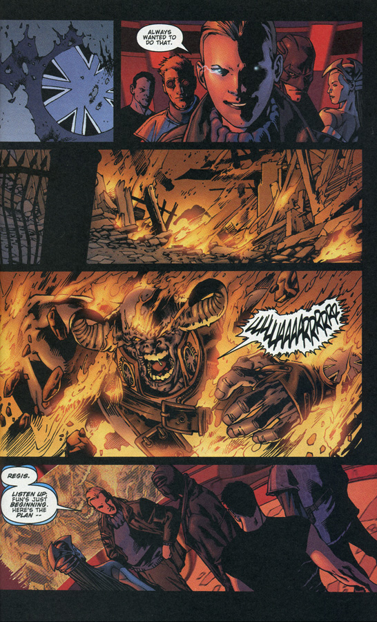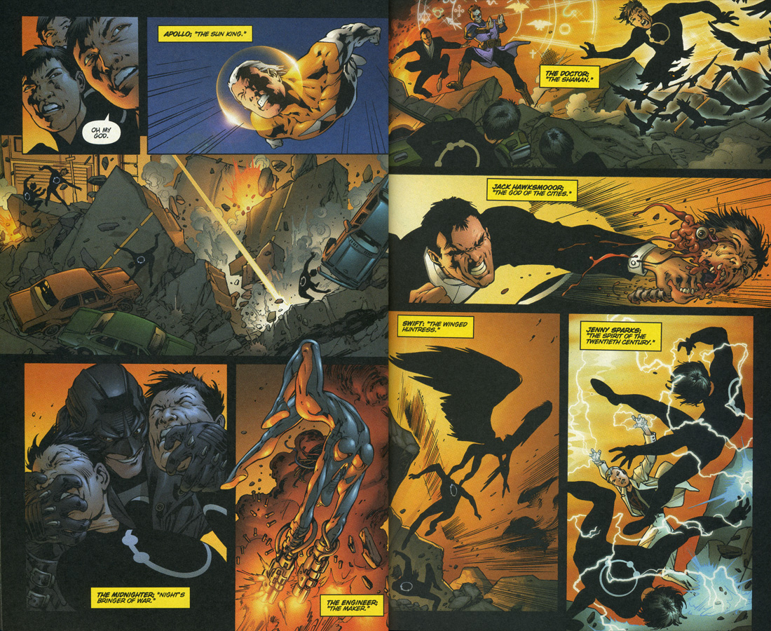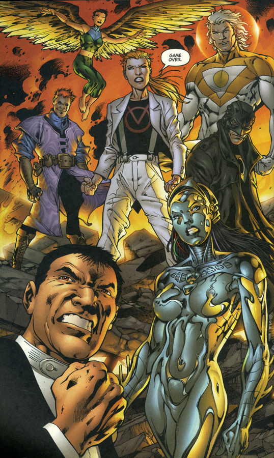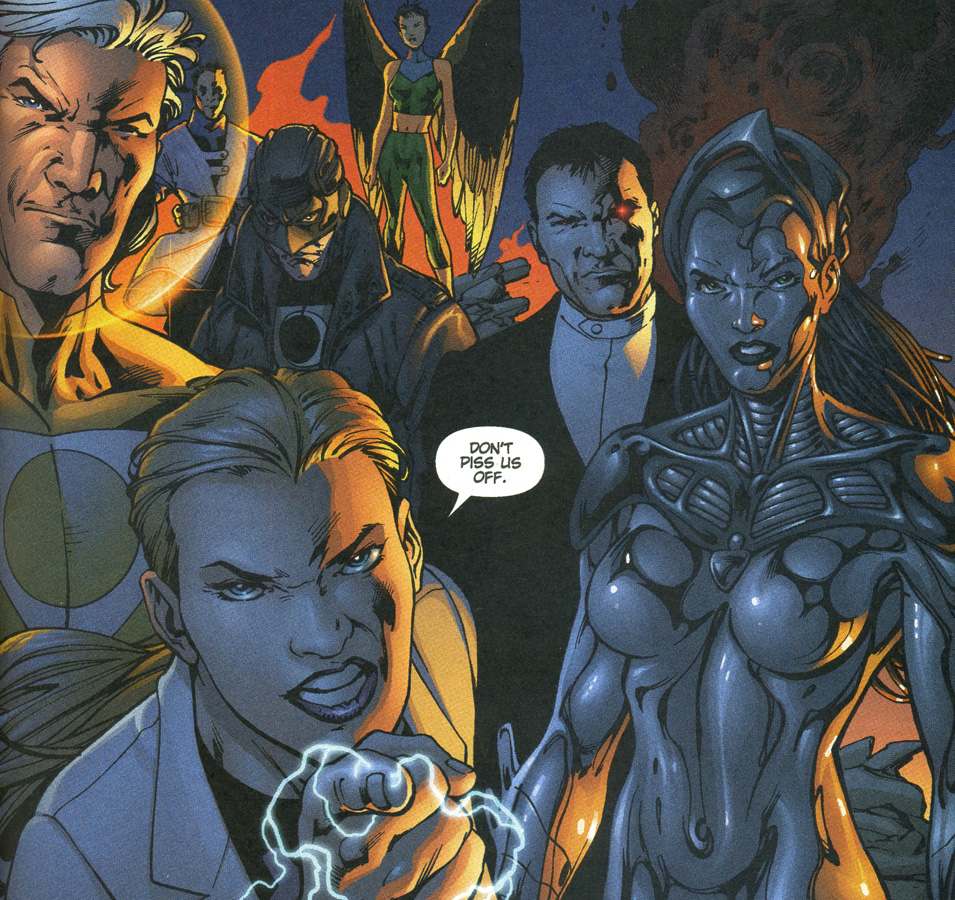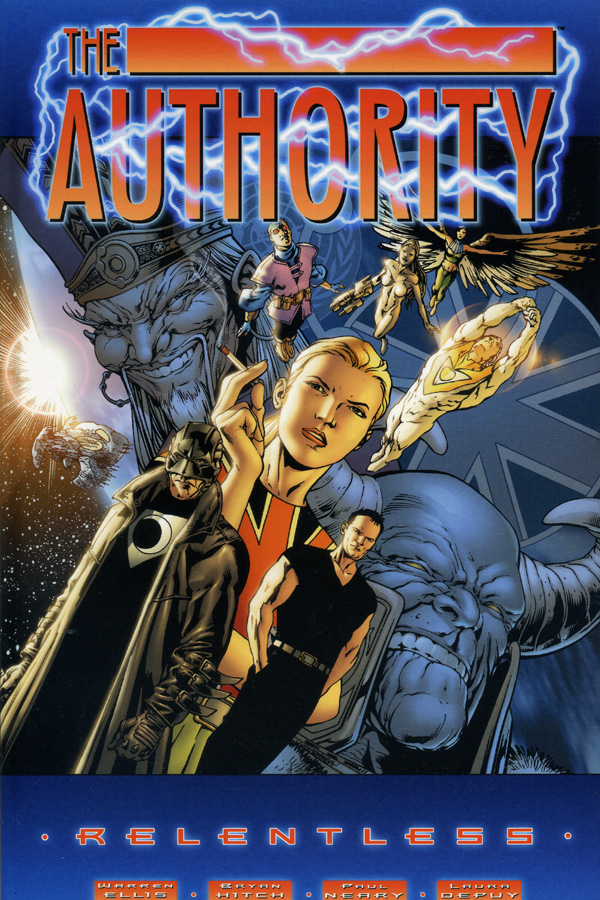 The Authority, es un comic de superhéroes, pero no es otro comic de superhéroes más, este equipo va más allá de lo que normalmente nos han acostumbrado DC y Marvel con sus respectivos, JLA, Avengers, X-Men y etcéteras, este equipo tiene una actitud diferente, mas sarcástica y violenta, su trabajo es cuidar a la Tierra de cualquier amenaza, y si bien en un principio Stormwatch, que es de donde proceden, era un organismo que dependía de la ONU, ellos no le rinden cuentas a nadie, ellos son la máxima autoridad en la Tierra y esta es su protectorado, de ahí su nombre; sus enemigos van desde un demente dictador con un ejército de superhumanos; invasores de una Tierra paralela en la que los seres humanos y los extraterrestres hicieron contacto en el siglo XIV se mezclaron y crearon una civilización basada en un imperialismo expansionista bastantesui generis; el mismísimo Dios y por ultimo un brillante y demente científico que trabajando para EU creo muchos superhumanos durante los años de la guerra fría, y esto solo en los primeros cuatro arcos argumentales, que son los que he leído. Este equipo está conformado por 7 personas, Jenny Sparks, el espíritu del siglo XX, una mujer inglesa que aparenta unos 30 años pero que nació con el inicio del siglo, posee poderes eléctricos; Jack Hawksmoor el dios de las ciudades, hombre secuestrado repetidamente por extraterrestres quienes modificaron su cuerpo mas allá de lo imaginable; Apollo como su nombre lo indica obtiene sus poderes del Sol; The Midnighter, él puede saber que vas hacer antes de que lo hagas en una pelea, The Doctor, el actual Shaman encargado del cuidado de la Tierra; Swift la cazadora alada; The Enginneer, podemos decir que ella hace lo que quiere con su cuerpo, literalmente. Los creadores de este comic son Warren Ellis en el guion yBryan Hitch en los lápices, actualmente se han publicado dos tomos recopilatorios que abarcan los primeros 16 números, en los cuales tenemos al equipo Ellis y Hitch hasta el número 12, en el numero 13 entra al quite un nuevo equipo, Mark Millar y Frank Quitely. Afortunadamente para nosotros editorial Vid ha empezado a publicar esta serie en español, apenas este mes publicaron el número cero que corresponde, según leí, al Stormwatch #11, según anunciaron la van publicar mensualmente, pero en caso de que no quieras esperar tanto para emparejarte con su publicación estadounidense que ya va para el número 20, se pueden adquirir los tomos recopilatorios o los números individuales en tu tienda de comics de confianza. Los primeros 12 números de esta serie tienen una gran calidad de dibujo, no se cuánto tiempo paso del Stormwatch #11 al primer número de The Authority, pero el trazo de Hitch mejoro mucho, así que si compraste el #0 que publico Vid y el dibujo no te pareció nada excepcional, espérate a ver los siguientes números y te aseguro que te vas a sorprender, muchas de las páginas bien parecen una secuencia cinematográfica. El dibujante del segundo equipo no me parece tan bueno, pero no está mal y bien vale la pena seguir comprando este comic.
